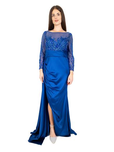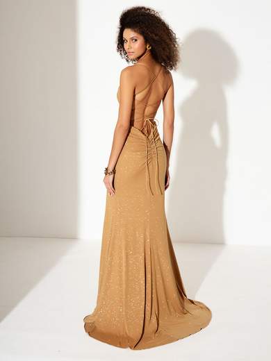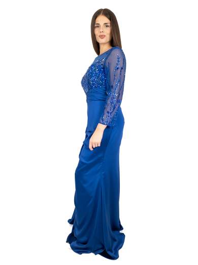 Abito lungo cerimonia. Questo vestito elegante presenta un corpetto a corsetto glitterato e semitrasparente, con chiusura posteriore a intreccio e zip per un look raffinato.