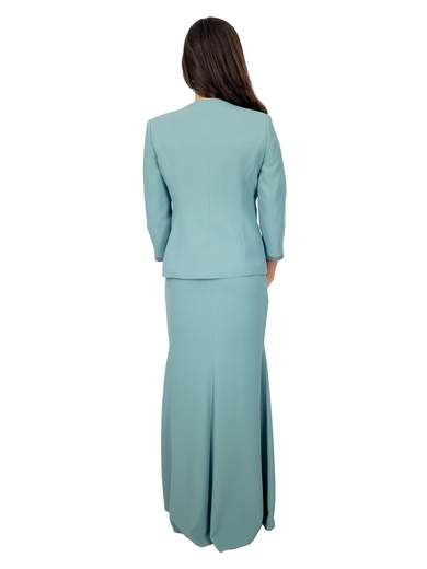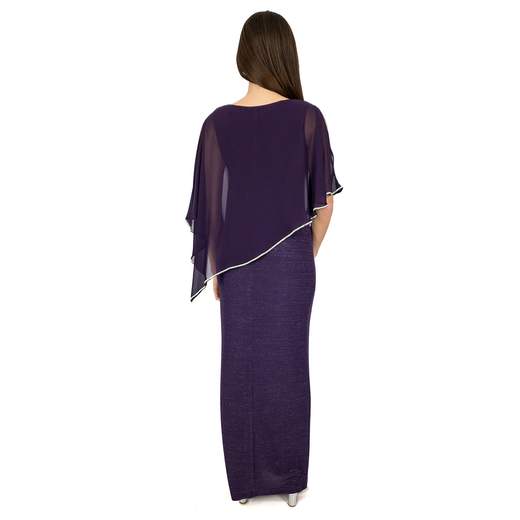 L’abito presenta un raffinato gioco di paillettes applicate su una trama geometrica, aggiungendo luminosità senza eccessi. Ogni dettaglio è studiato per garantire un effetto scenografico ma discreto, perfetto per chi cerca uno stile unico. La mantella asimmetrica offre una copertura leggera ma di grande impatto visivo, rendendo questo abito ideale anche per le cerimonie serali.