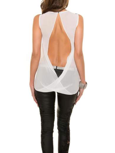 Camicetta senza maniche con fiocco, spalle scoperte, scollo a v, inserto in tulle ricamato, chiusura con bottoni e fiocco. Camicetta in chiffon leggera e trasparente per la stagione primavera estate.
