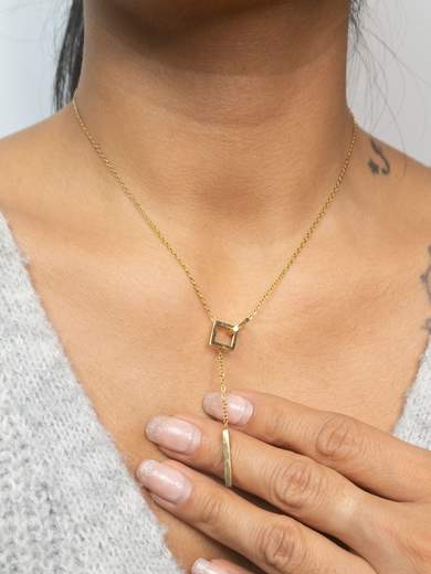 Il pendente, caratterizzato da un nodo geometrico con due forme rettangolari intrecciate, si abbina a una barra sottile che aggiunge un tocco di linearità al design. La lunghezza regolabile della collana (40 + 5 cm) consente di adattarla a qualsiasi scollatura, mentre il suo peso leggero di 3 g garantisce un comfort eccezionale.