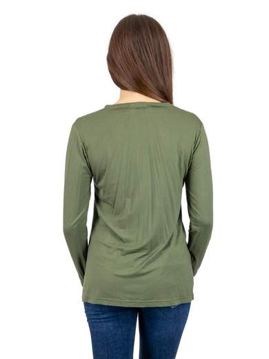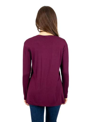 Polo donna a maglia taglie forti, manica lunga, invernale, scollo a V con finti bottoni. Parte frontale a fantasia, parte posteriore a tinta unita. Maglia donna invernale lunga tessuto morbido al tatto e caldo.