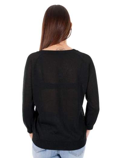 Maglia donna manica lunga in cotone scollo a v traforata. Tessuto leggermente elasticizzato, vestibilità morbida, ideale per le mezze stagioni.