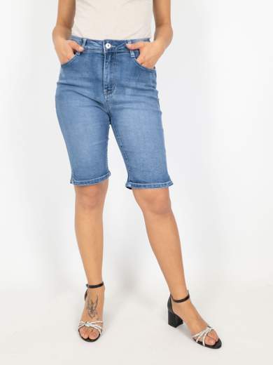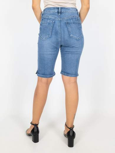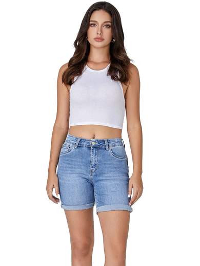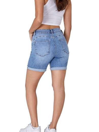 Shorts jeans corti slim fit a vita alta, denim chiari sfrangiati. Pantaloncini corti jeans con chiusura zip ed un bottone, 4 tasche, passanti in vita, cuciture a contrasto.