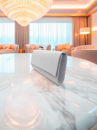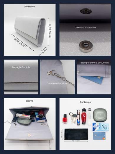 La pochette cerimonia argento è l’accessorio ideale per valorizzare ogni outfit elegante. La superficie con glitter luminosi da una parte e dall'altra impreziosita da strass brillanti che catturano la luce e donano un effetto raffinato e scenografico. Il design rigido e compatto garantisce una forma impeccabile, perfetta per eventi formali, cerimonie e serate speciali.