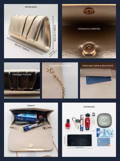 Dotata di manici staccabili ricoperti di strass e di catenella removibile, offre massima versatilità: a mano per un look sofisticato o a tracolla per maggiore praticità. Pensata per contenere l’essenziale con stile, è la scelta perfetta per chi cerca un accessorio elegante, brillante e funzionale.