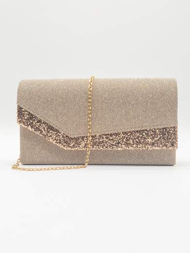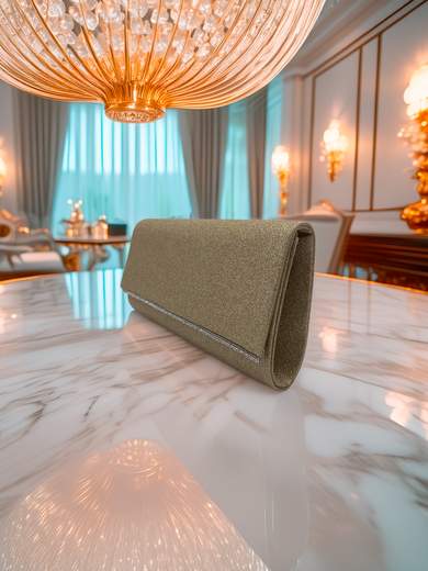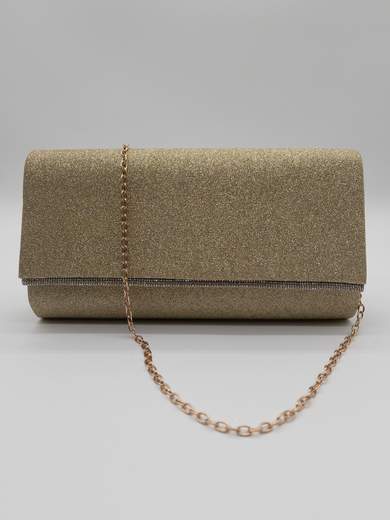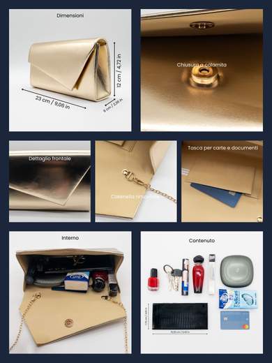 Rendi unico ogni tuo outfit con questa pochette oro elegante, pensata per accompagnarti con stile a cerimonie, eventi speciali e serate chic. Caratterizzata da una raffinata patella glitterata con chiusura a calamita, offre un mix perfetto di funzionalità e fascino. Il manico rigido e la tracolla in catena dorata removibile da 115 cm ti permettono di indossarla a mano o a spalla con estrema versatilità.