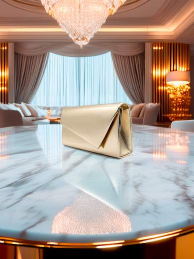 Pochette oro elegante con manico rigido e tracolla a catena removibile
