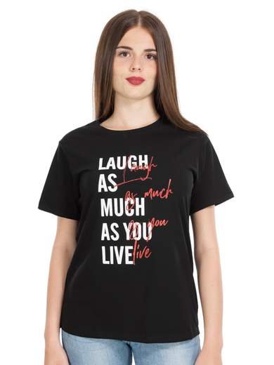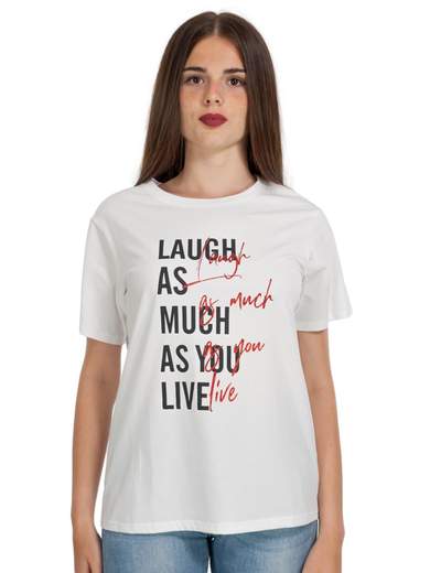 T-shirt donna con scritte o stampe a manica corta. Maglietta in cotone a girocollo. La nostra T-shirt donna è un capo versatile e di tendenza, perfetto per completare il tuo look quotidiano.