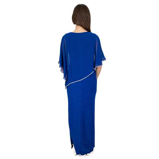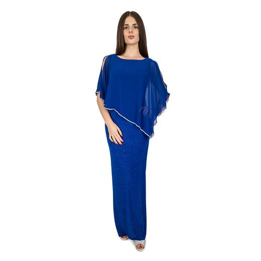 Tuta elegante da cerimonia in tessuto stretch smanicata con pantaloni larghi, cucitura in vita e chiusura zip posteriore. Jumpsuit con corpetto e gonna in georgette con due spacchi, giromanica e girocollo con strass.